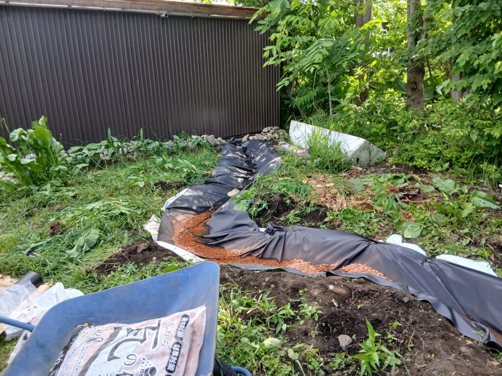 防草シートを張るように、ピンを打ちこみます。ここでも、カーブを作ったことによりしわが出ていますがなるべく水の流れに逆らわないように張っていきます。