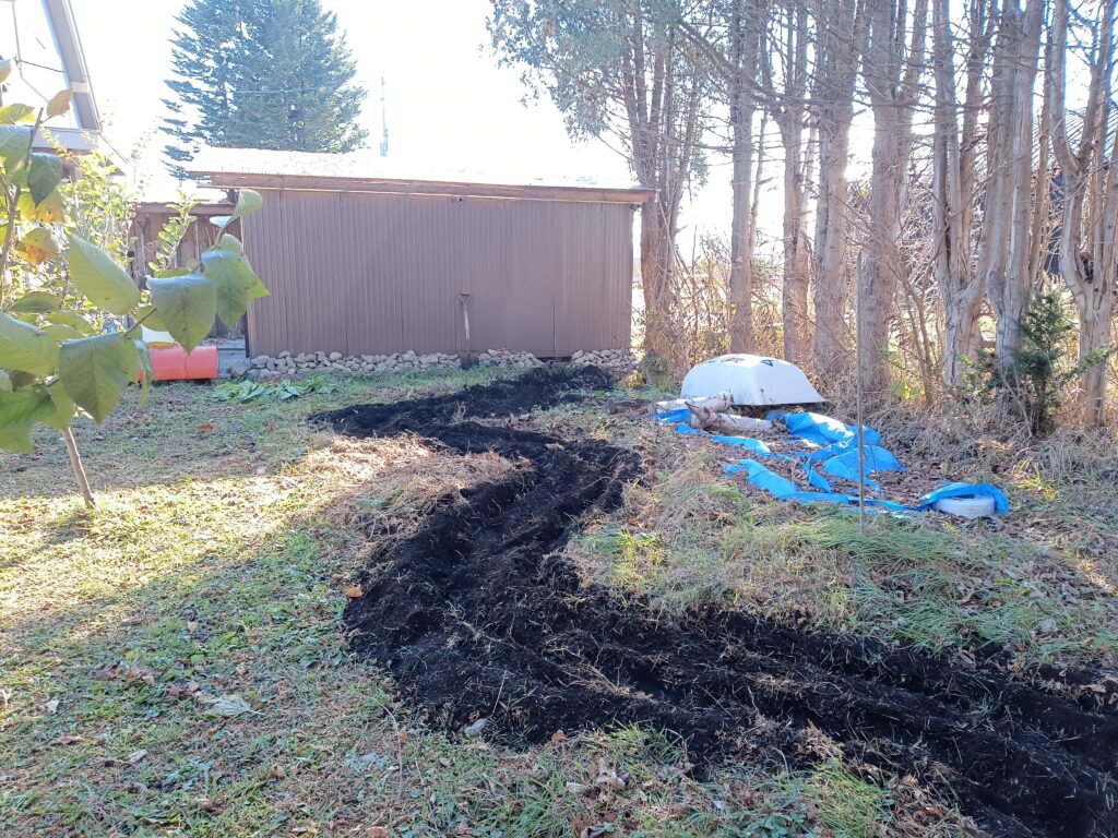 で、この池を防水としたいので、粘土質の土と石灰を使って膜をつくっていきました。一応は水をはれたのですが、何度修繕してもひび割れが起きるのと、水の濁りが取れないので結局プールライナーといって防水シートを張ることにしています。ここら辺は、庭に池をDIYしている先駆者たちが色々と詳しいことを書いているので割愛しますが、私もプールライナーを使用するのが一番良いと思います。