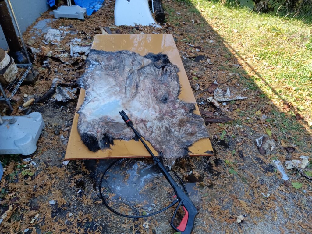 ヒグマの皮は厚く、脂がしっかりついているため、高圧洗浄機で大まかにそぎ落とします。