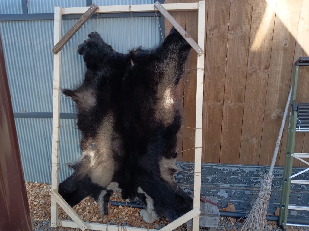 仕上がったヒグマの毛皮は、光の当たり方で深い焦げ茶から黒へと変わります。