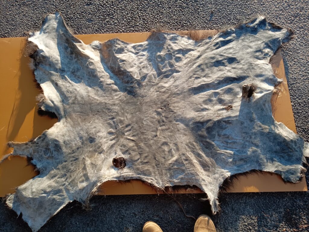 この頃は、鞣し小屋も作っておらず、庭の一角でやっていました。なので至る所に脂や肉片が飛び散って、匂いもする。片付けも散らばったものはやりにくかったので、土をかけて処理していたのを思い出します。今思えば、よくこんな環境でなめしをやっていたなと思います。住宅街ではちょっと難しいとも思いますが、まぁやっている人は何人かいるのでやり方次第なのでしょうね。