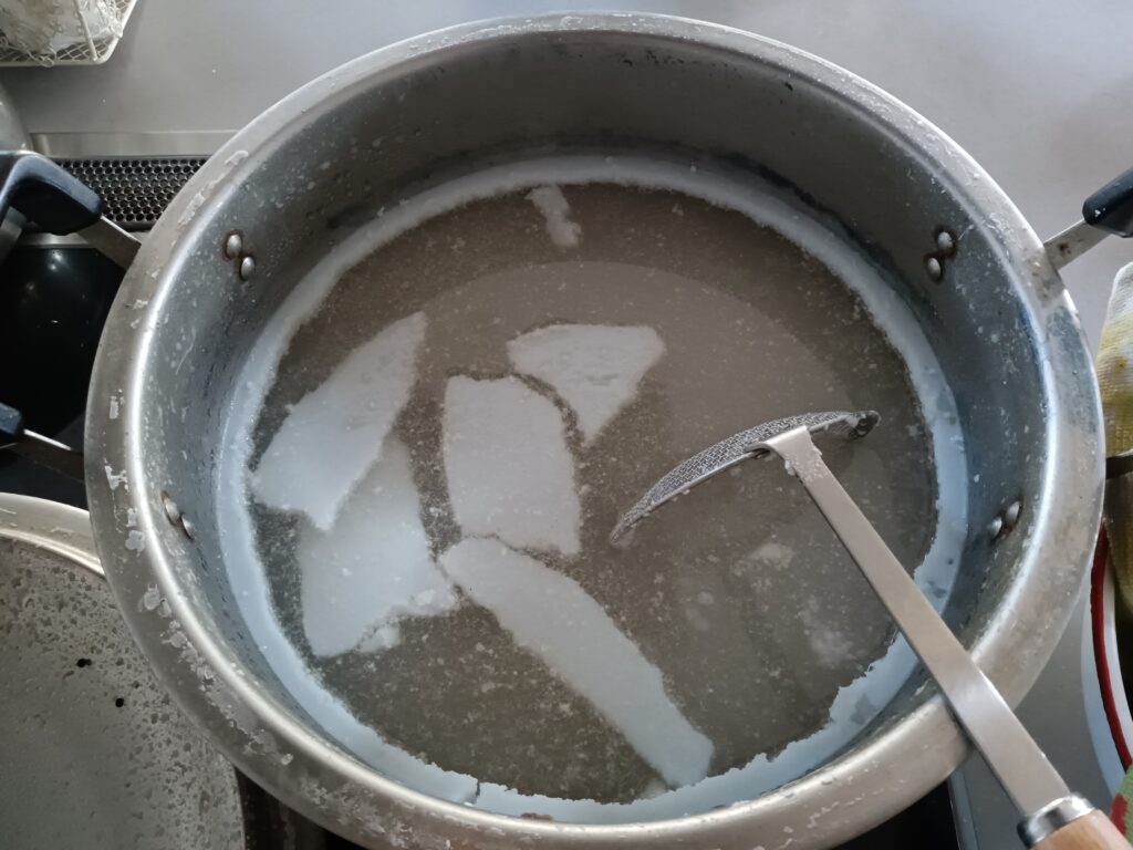 - 火を止めて冷ますと、上に脂、下に水と沈殿が分かれます。