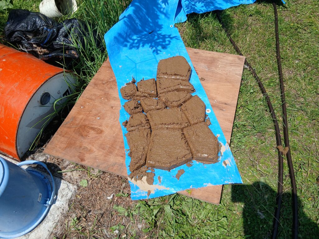 穴を掘って、粘土質の土を採取して、それに脱毛工程で出る石灰液と、毛を1:1:1くらいで混ぜるとレンガっぽい何かができたのです。ただこれは要研究ですね。もともと日干し煉瓦は雨の少ない地域で発達した技術なので、雨が多いと形がくずれたりしてます。改良や、用途を絞って使っていこうと思います。