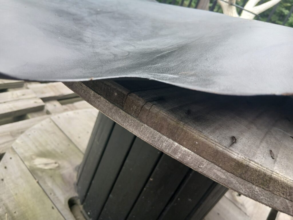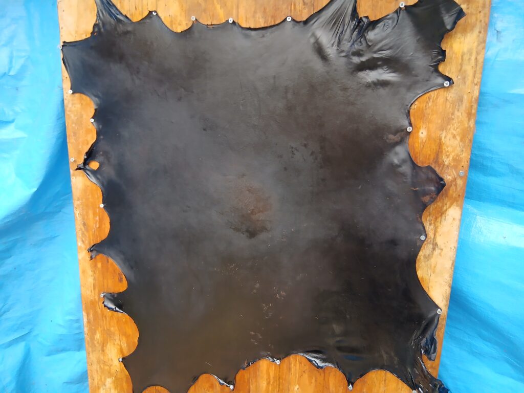 しかし、浸漬期間、黒化の条件、乾燥スピード、加脂の吸い込み、といずれも季節や素材の状態に強く左右され、再現性が高いとは言えません。作りたい革を作るのが目標ですので、本当に奥深い世界です。そしてこの革、乾燥途中だったの気づかないで丸めて保管してしまって、しわができてしまった・・・なのでこの画像はその前のもの。