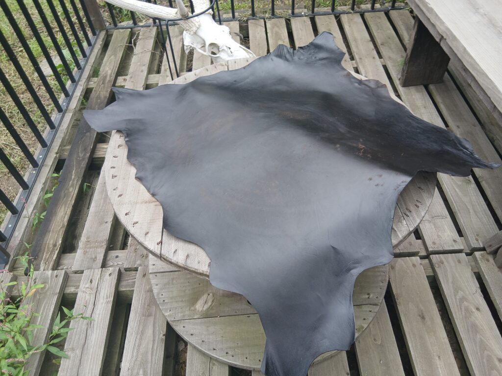 今回の革は、黒化と柔軟性のバランスが良く、仕上がりとしてはこんな感じでした。柔らかすぎても小物を作る時芯材いれなければならなくなるので、ハリを重視して柔軟・乾燥させました。