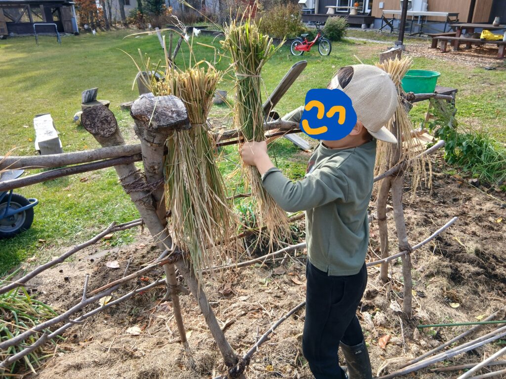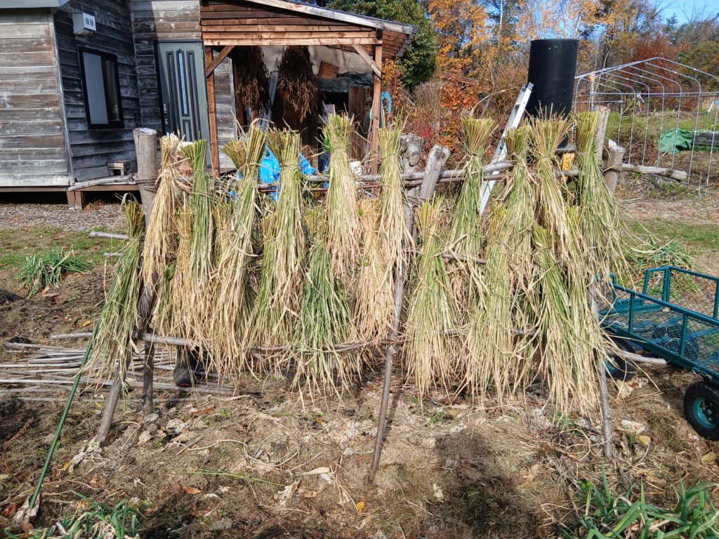 11月上旬、晴れた日を選び、息子と一緒に収穫してはさ掛けをしました。